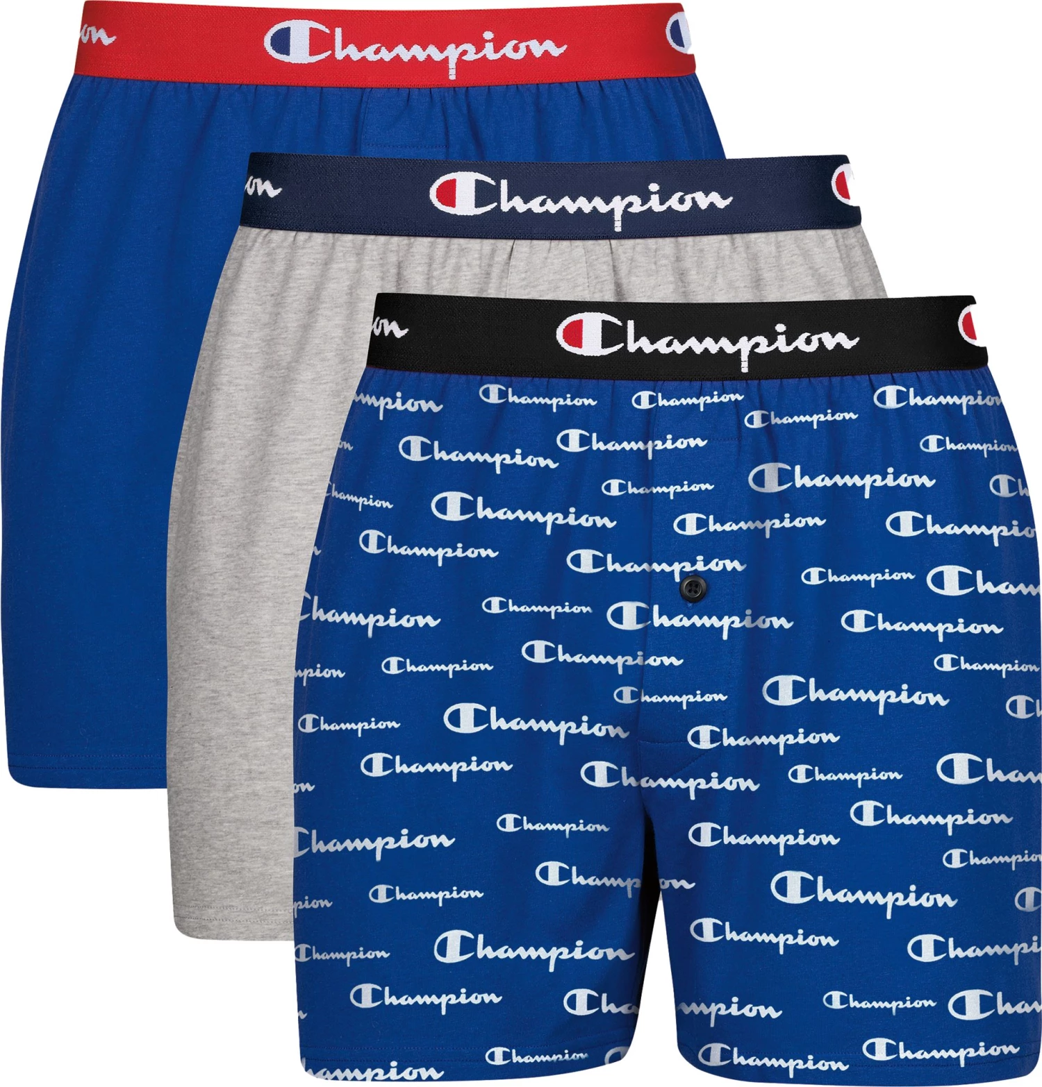 Go-to boxers move with you for all-day comfort. Wicking, stretch fabric keeps you cool and dry, while anti-odor technology delivers a fresher experience, wherever the day takes you. Boxers are made with a shorter leg and no-ride-up fit that stays in place, no matter how hard you play. Smooth, flat seams prevent irritation. Repeating logo waistband plays up authentic, Champion style.